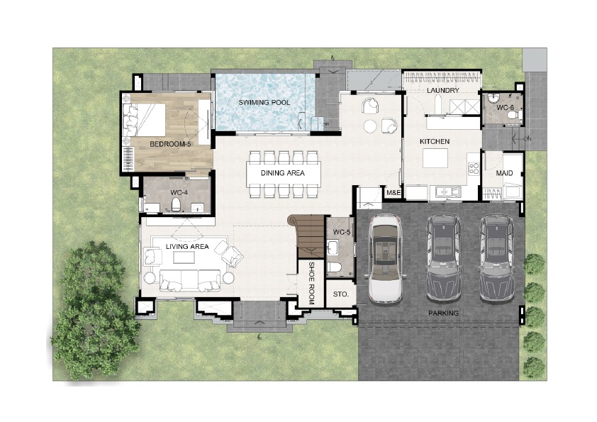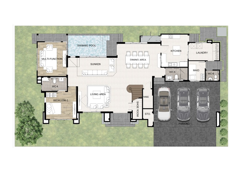 บ้านเดี่ยว พื้นที่ใช้สอย 483 ตร.ม. 5 ห้องนอน 5 ห้องน้ำ 3 จอดรถ สระว่ายน้ำส่วนตัว SUNKEN LOUNGE ROOM ส่วนรับแขก ส่วนพักผ่อน Family Area ส่วนรับประทานอาหาร ครัวไทย ห้องแม่บ้าน พร้อมส่วน Service