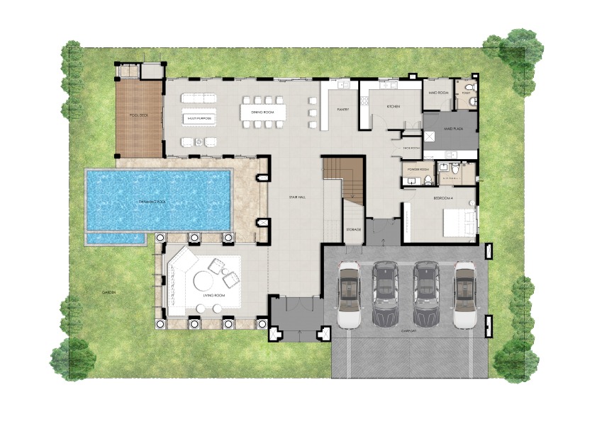 บ้านเดี่ยว พื้นที่ใช้สอย 668 ตร.ม. 4 ห้องนอน 5 ห้องน้ำ 4 จอดรถ Double Living Room พร้อมสระว่ายน้ำส่วนตัว ห้องรับประทานอาหาร Maid Plaza ห้องแม่บ้าน พร้อมส่วน Service