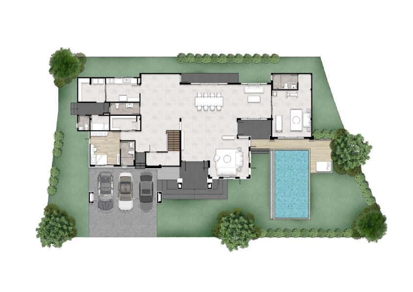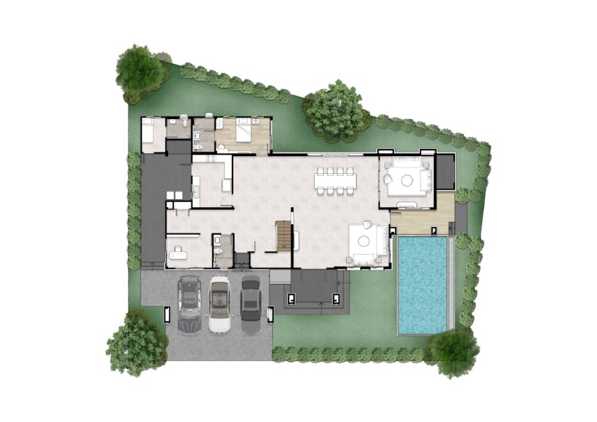 บ้านเดี่ยว พื้นที่ใช้สอย 392 ตร.ม. 4 ห้องนอน 5 ห้องน้ำ 3 จอดรถ สระว่ายน้ำส่วนตัว ส่วนรับแขก ส่วนพักผ่อน Family Area ส่วนรับประทานอาหาร ครัวไทย ห้องแม่บ้าน พร้อมส่วน Service