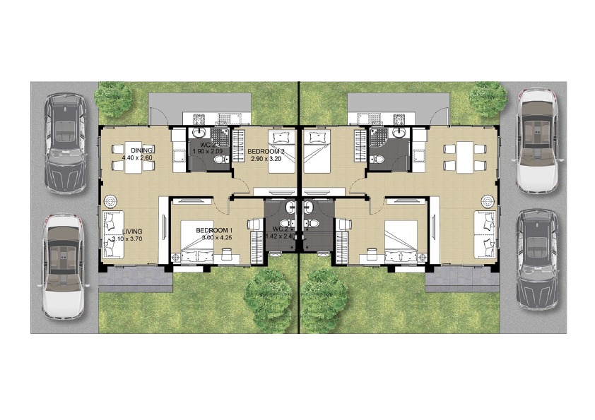 พื้นที่ใช้สอยรวม 96.57 ตร.ม. 2 ห้องนอน , 2 ห้องน้ำ และ ที่จอดรถ 2 คัน