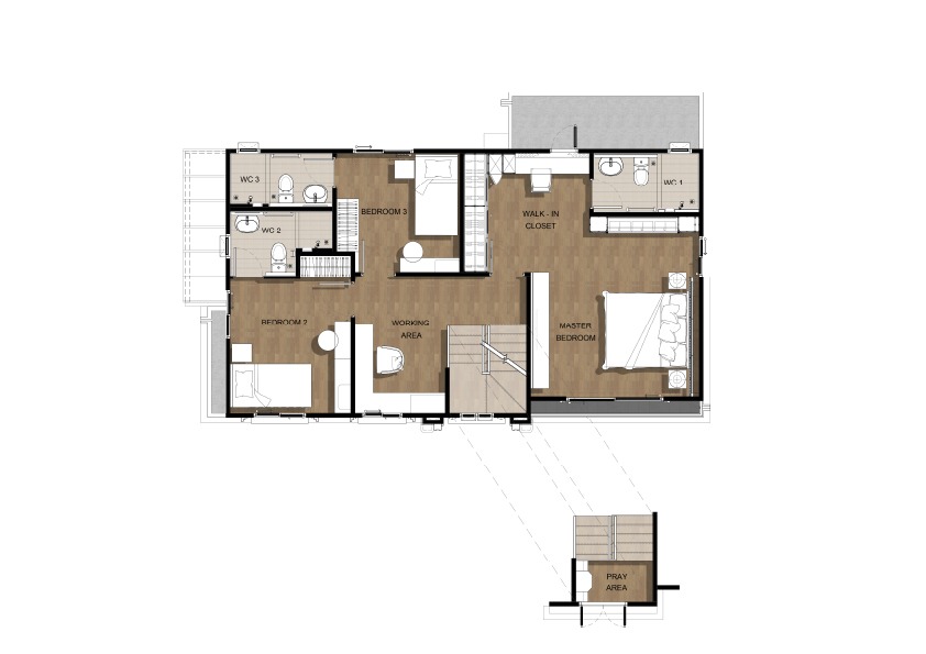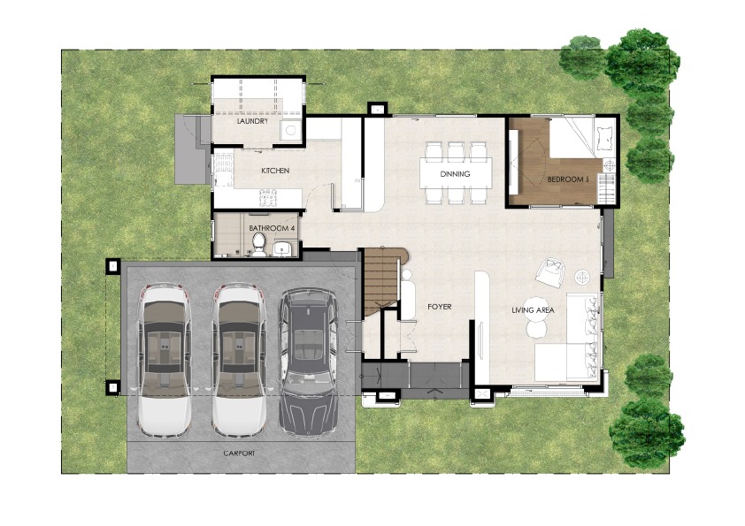 พื้นที่ใช้สอย 320 ตร.ม. 5 ห้องนอน 5 ห้องน้ำ ห้องรับแขก, ห้องรับประทานอาหาร ฟังก์ชันพิเศษ ห้องพระ และที่จอดรถ 3 คัน