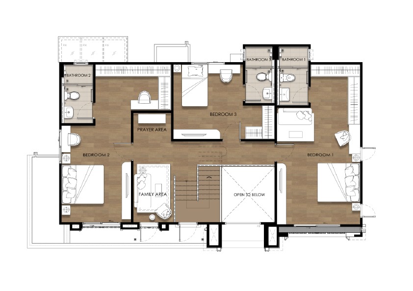 พื้นที่ใช้สอย 251 ตร.ม. 5 ห้องนอน 5 ห้องน้ำ ห้องรับแขก, ห้องรับประทานอาหาร ฟังก์ชันพิเศษ ห้องพระ และที่จอดรถ 2 คัน