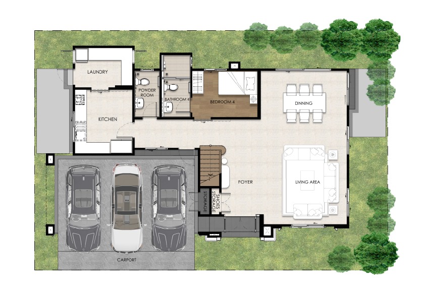 4 ห้องนอน / 4 ห้องน้ำ / ส่วนพักผ่อน / ห้องพระ / ห้องรับประทานอาหาร พื้นที่อเนกประสงค์ / ห้องครัว / Laundry room / ที่จอดรถ 3 คัน