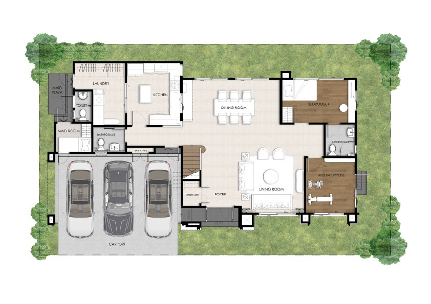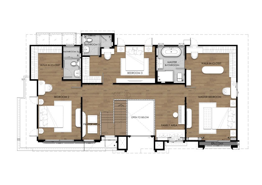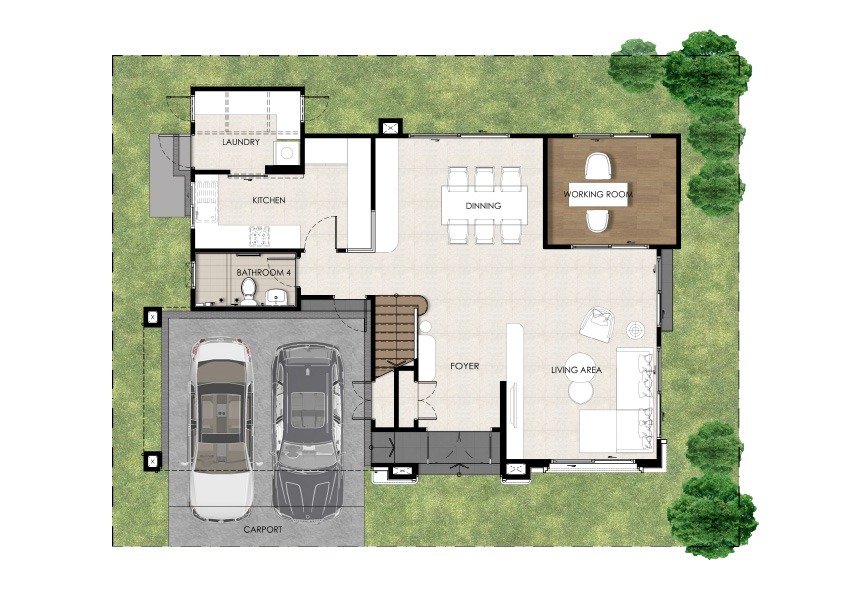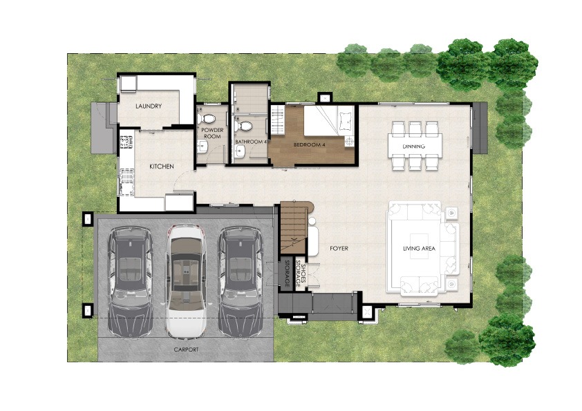 บ้านเดี่ยว พื้นที่ใช้สอยรวม 306 ตร.ม. 4 ห้องนอน 5 ห้องน้ำ Family Living Room , ห้องพระ , Multipurpose room , ห้องรับประทานอาหาร , ห้องครัว , Glass House , ห้องแม่บ้าน และที่จอดรถ 3 คัน