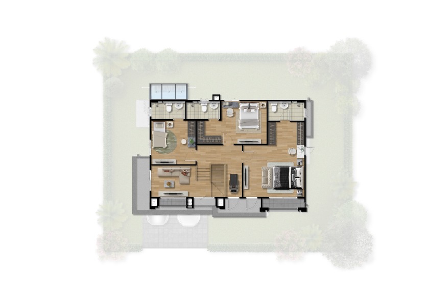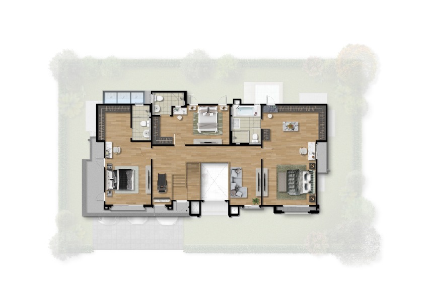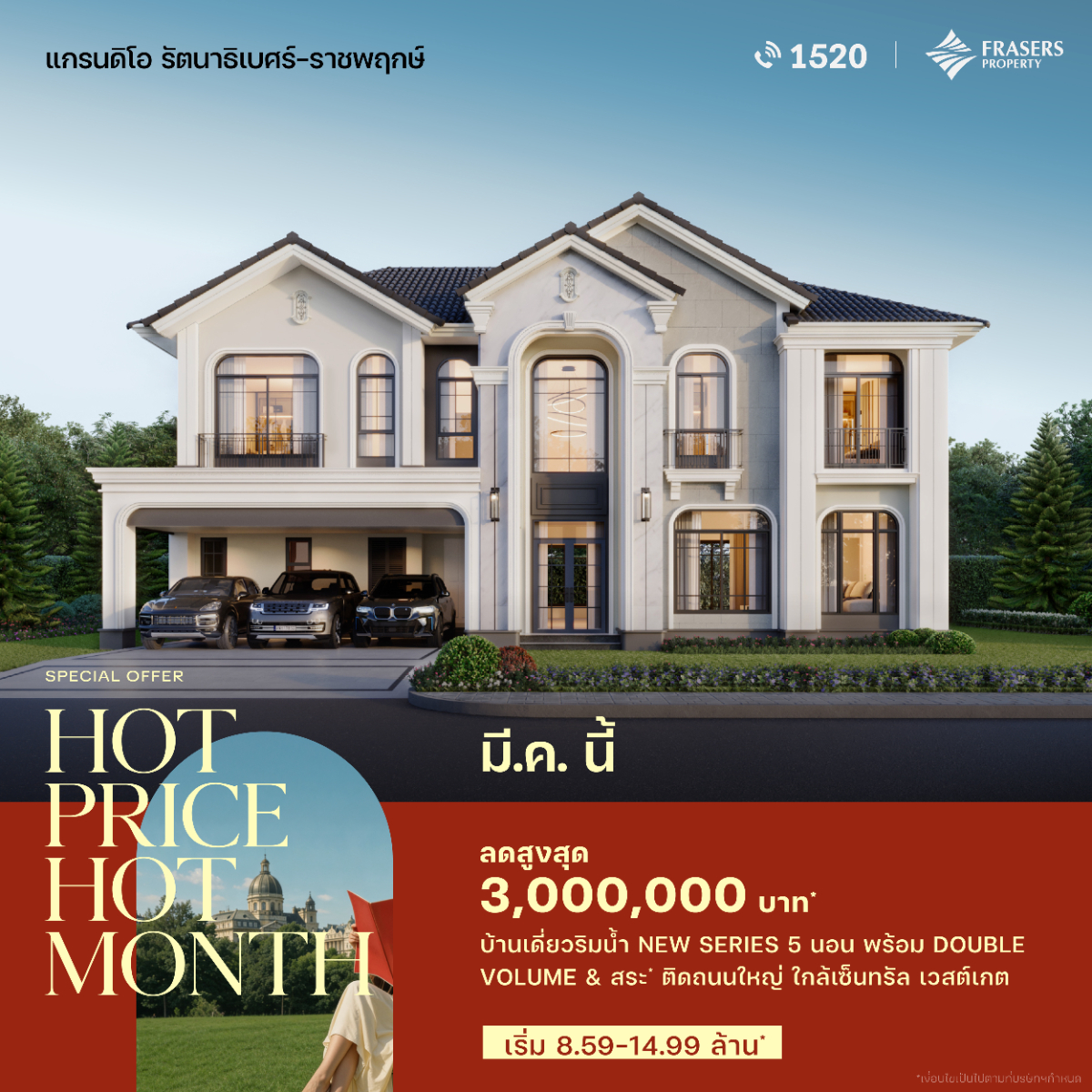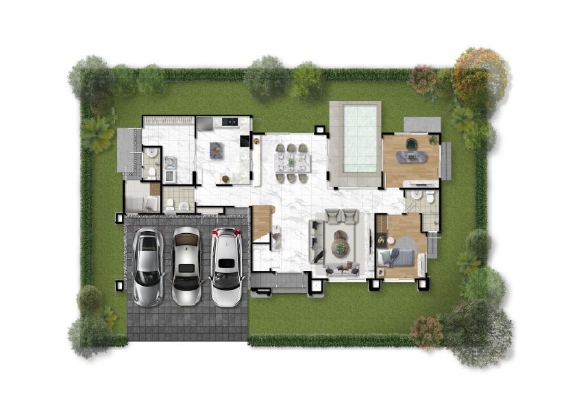 พื้นที่ใช้สอย 320 ตร.ม. 5 ห้องนอน 5 ห้องน้ำ ที่จอดรถ 3 คัน และสระว่ายน้ำส่วนตัว พร้อมระบบว่ายน้ำทวนกระแส มาพร้อมฟังก์ชั่นพิเศษทั้งระบบอากาศ Frasers Clean and Cool Air และ EV Charger ที่โรงจอดรถ