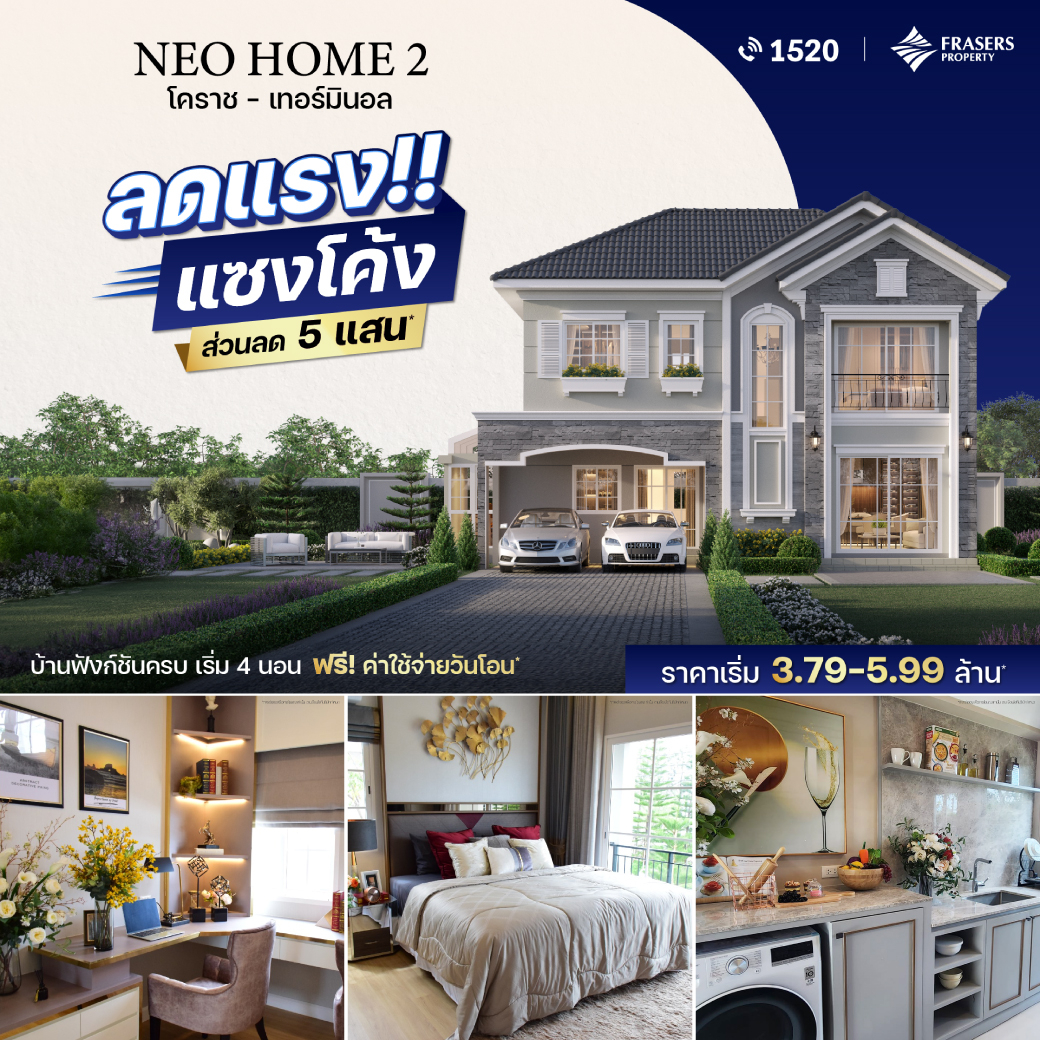 บ้านนีโอ โฮม พื้นที่ใช้สอยรวม 155 ตร.ม. 4 ห้องนอน 3 ห้องน้ำ ฟังก์ชั่นพิเศษ Family area ห้องรับประทานอาหาร, ครัวไทย และที่จอดรถ 2 คัน