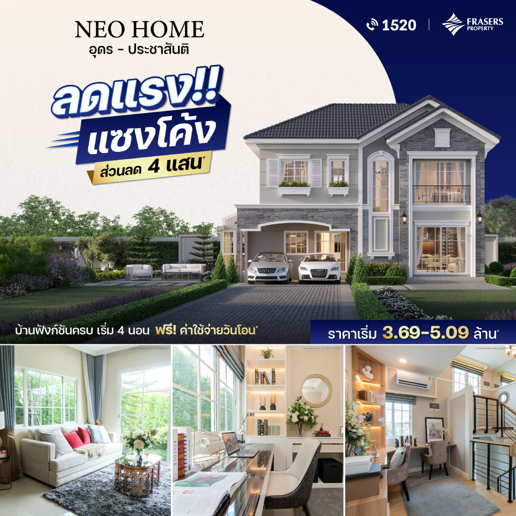 บ้านนีโอ โฮม พื้นที่ใช้สอยรวม 155 ตร.ม. 4 ห้องนอน 3 ห้องน้ำ ฟังก์ชั่นพิเศษ Family area ห้องรับประทานอาหาร, ครัวไทย และที่จอดรถ 2 คัน
